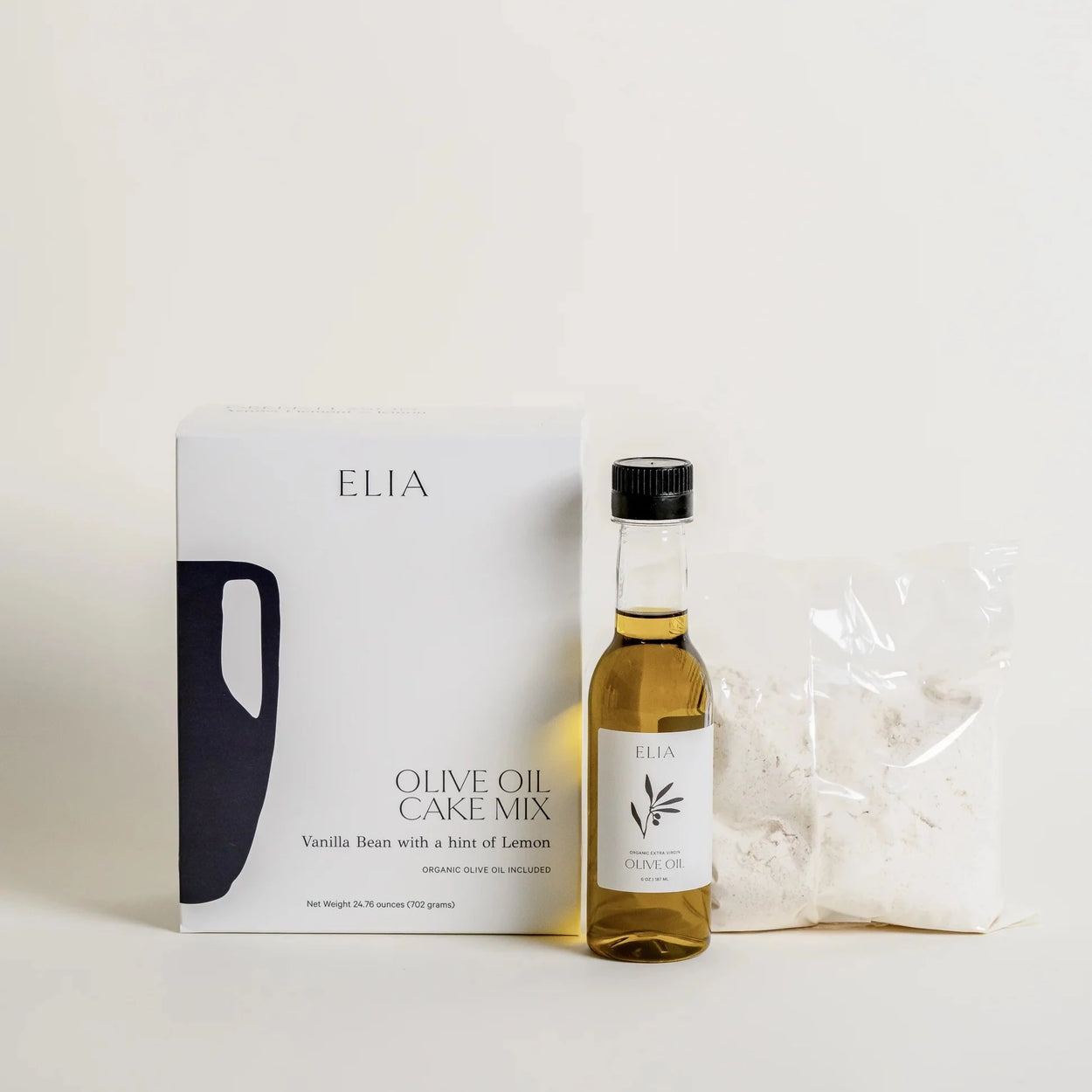 Olive oil cale mix by ELIA: Mezcla para hornear de aceite de oliva extra virgen, procedente de las arboledas del Peloponeso griego. Una mezcla para pastel para el paladar sofisticado que disfruta de las cosas buenas de la vida. Deléitate con su sabor Almond & Citrus.