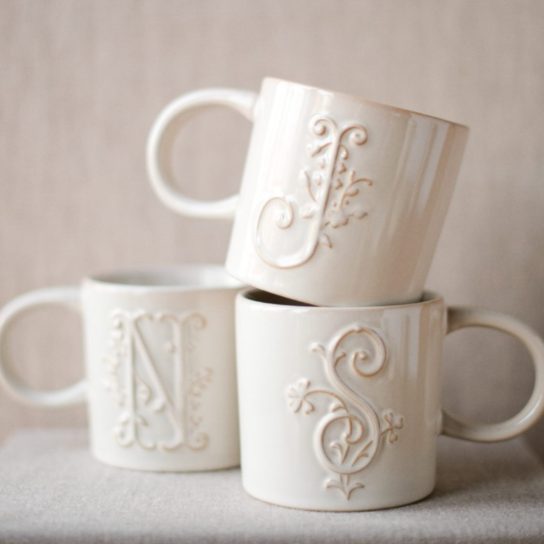 Monogram Mug by Fringe: De su reciente colección Prairie, este mug de cerámica artesanal te conquistará con sus hermosos monogramas en relieve. Esmaltado en color crema semitransparente. 13oz.