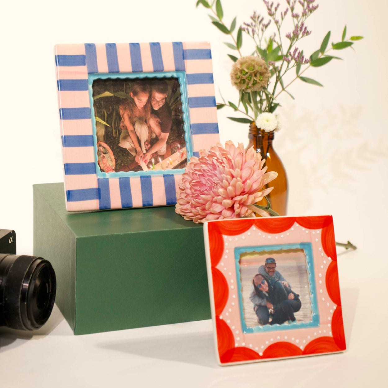 Marcos de cerámica Hazel Mazel: Este set de 2 portaretratos con diseños alegres y coloridos combina patrones pintados a mano que se complementan, convirtiéndolo en piezas únicas que llenarán de emoción y recuerdos cualquier espacio. Hechos a mano con atención al detalle y listos para contar historias.