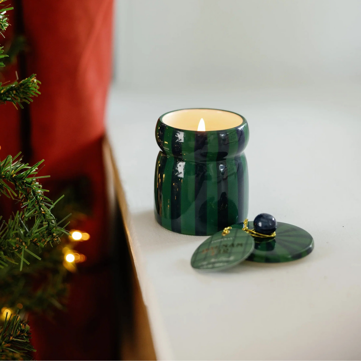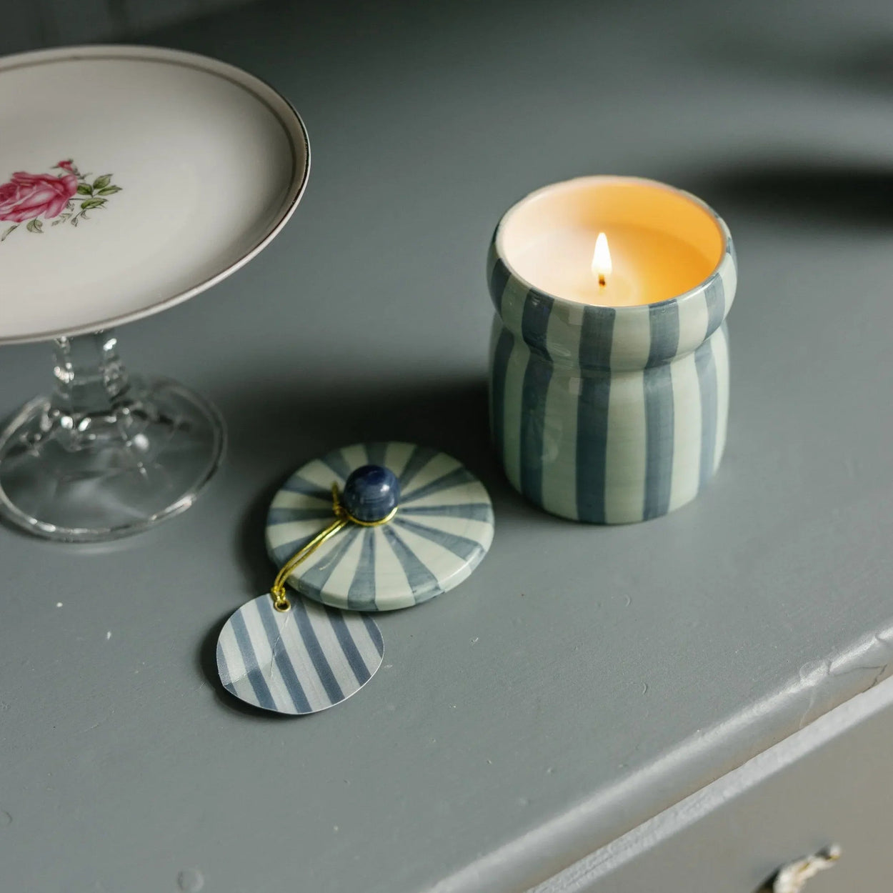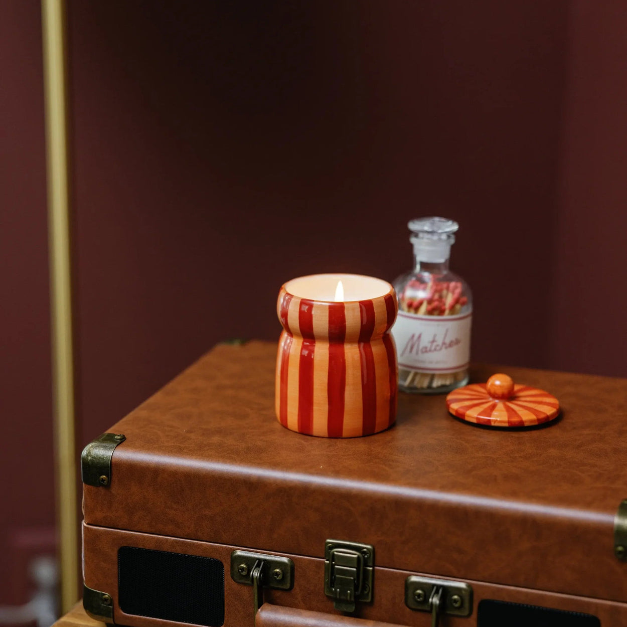 Diseñadas para evocar los aromas relajantes y transformadores de la temporada, estas velas pintadas a mano, inspiradas en sombrillas rayadas, tienen el tamaño perfecto y una forma única y compacta.
