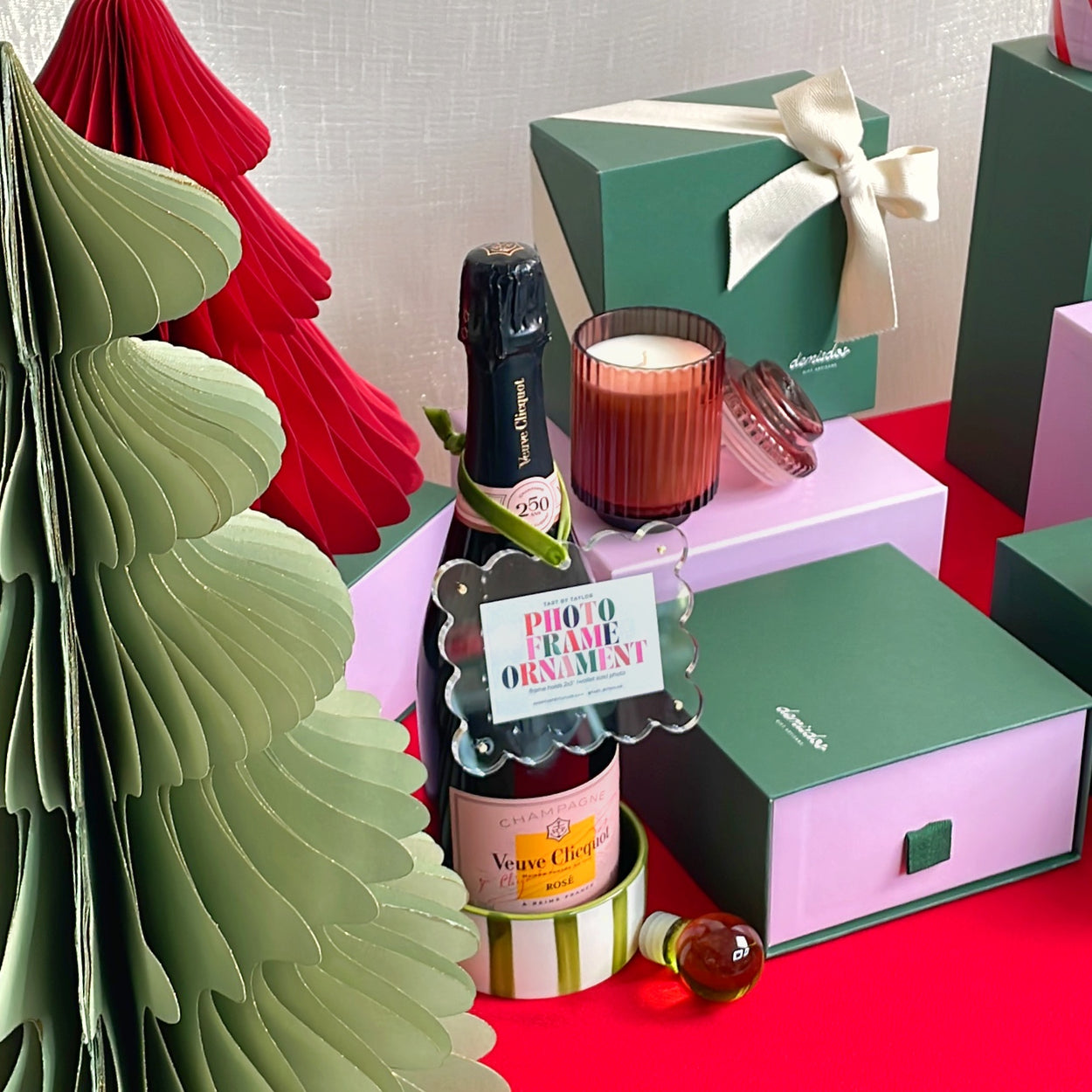 Ornament Picture Frame: Este marco en acrílico brillante y adornado con una cinta de terciopelo a juego, ¡dará un toque de alegría festiva a tu decoración navideña! Está compuesto por 2 paneles que se unen fácilmente con cuatro imanes de alta resistencia, donde podrás lucir fotos, tarjetas de buenos deseos o inlcuso usarlo como el tag de regalo mas chic, original y personalizado.
