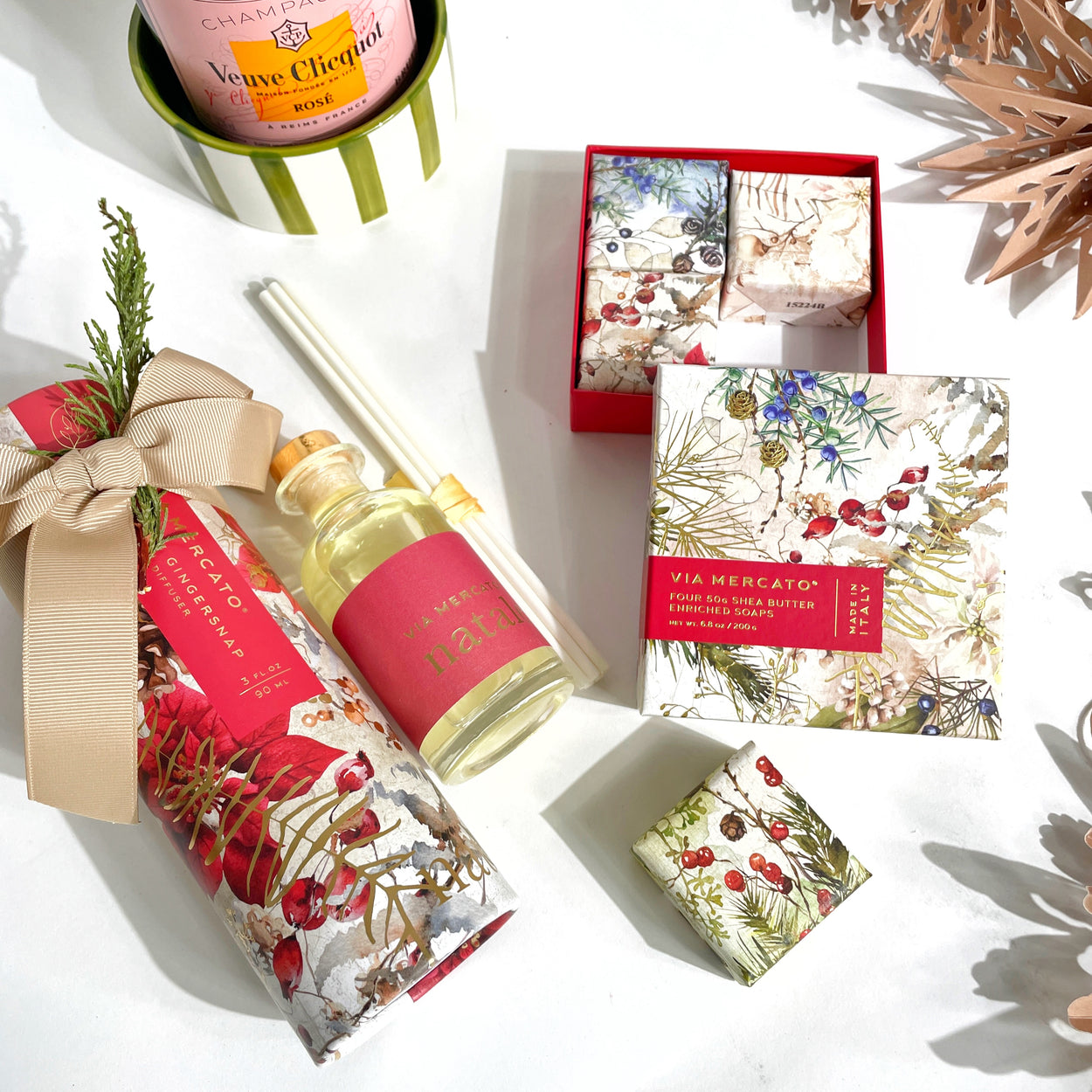 Natale Soap Set: Todo empieza con amor, como todolo hecho en Italia: amor por la belleza, el arte y la calidad presentes en los mercados locales. Este set de 4 jabones de 50g se inspira en los viajes a estos mercados, celebrando los sabores y aromas de la vida.