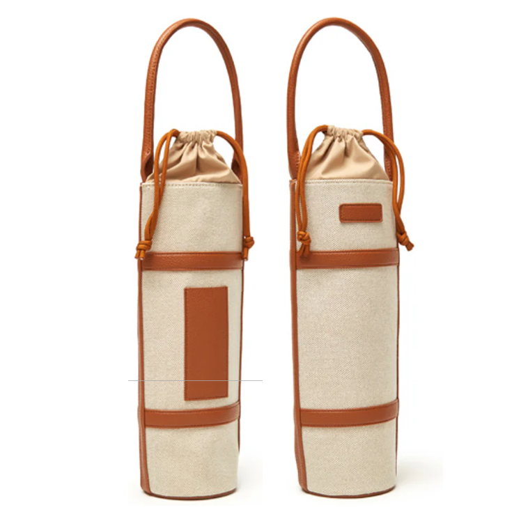 Fabricada en lona de algodón resistente al agua con detalles en cuero vegano de alta calidad, es duradera y fácil de transportar gracias a su asa. Incluye un bolsillo para el sacacorchos y un parche personalizable. Perfecta para quienes buscan artículos funcionales y versátiles para el día a día.