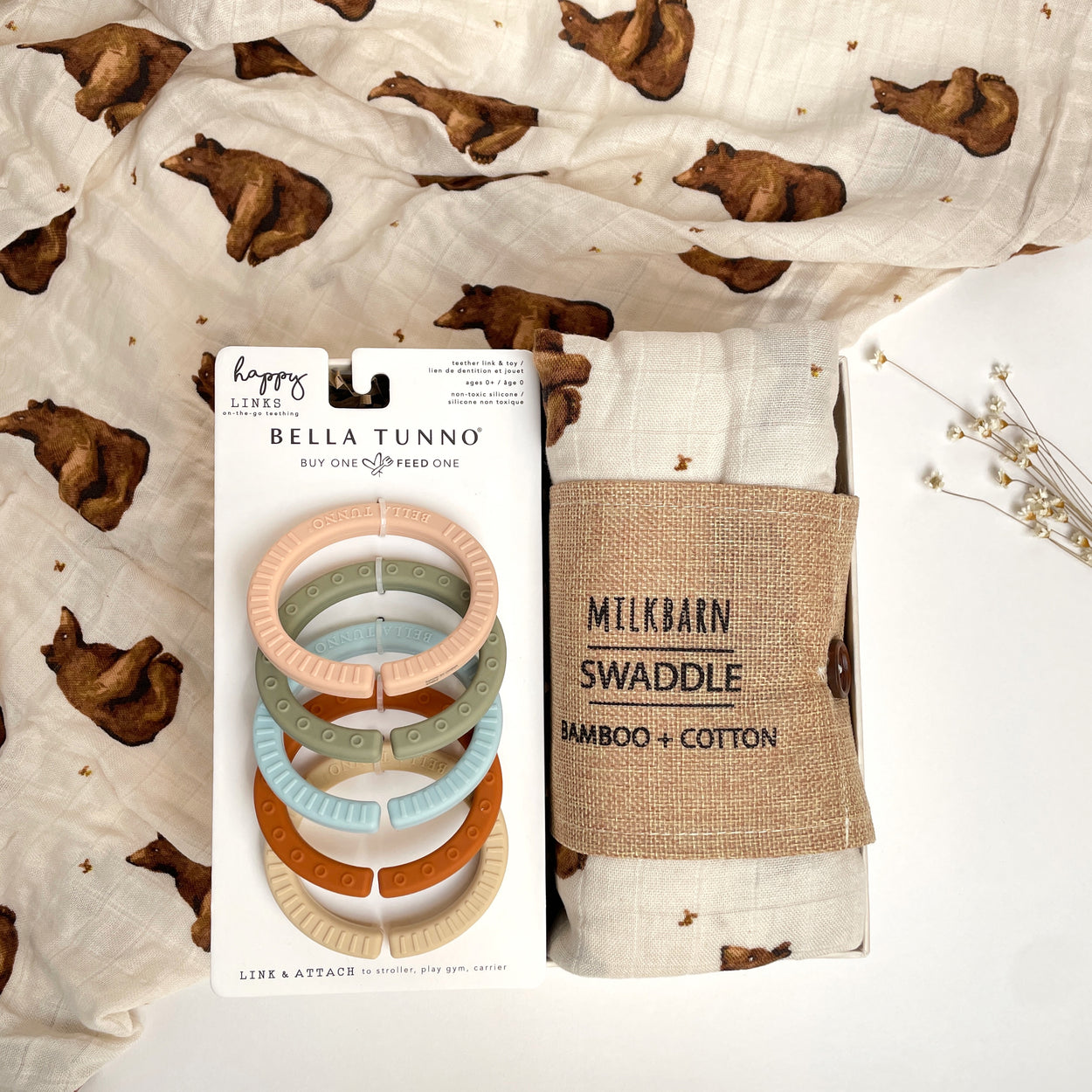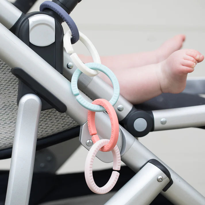Happy Links by Bella Tunno: Un colorido juego de 5 anillos montessori en silicona FDA para jugar y estimular la coordinación de los más pequeños mientras alivian las molestias de la dentición en sus encías. Tu bebé se mantendrá entretenido mientras los enlaza, los cuelga, los apila, cuenta, arma y desarma.