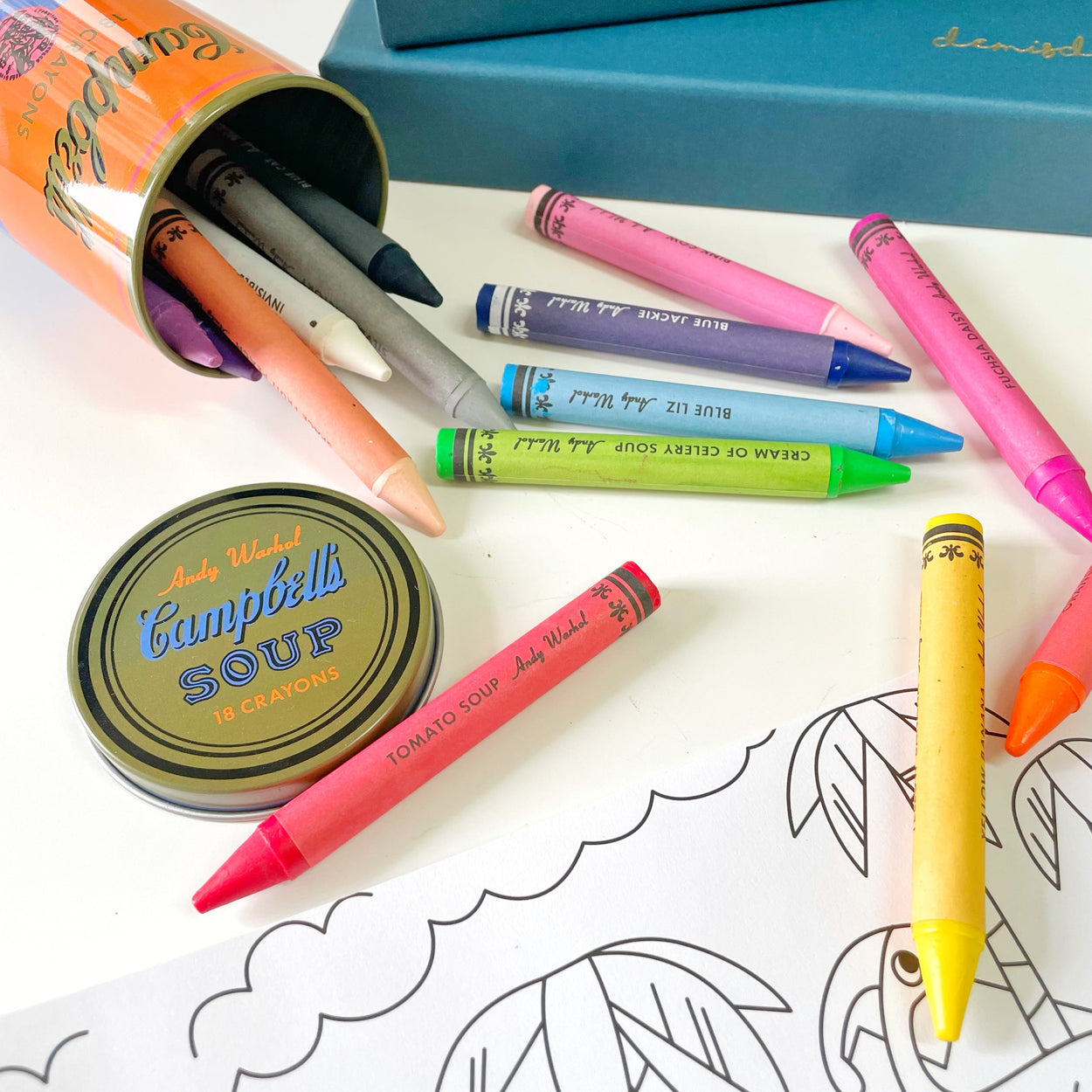 Crayolas Campbell's Tomato Soup: Una lata de 18 crayolas de colores deliciosamente creativa, inspirada en la icónica obra de Andy Warhol. Descubre sus divertidos nombres inspirados en Warhol como "Rojo sopa de tomate" y "Amarillo plátano". Edad: 3+